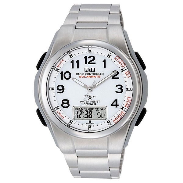 バンドカラー:シルバー、文字盤カラー:ホワイト、ケースの形状:ラウンドフェイス、表示タイプ:アナデジ表示、留め金:三ツ折れ両プッシュタイプ中留 フリーアジャスト、日付表示、曜日表示 その他 機能 アラーム 、 LEDライト 、回転ベゼル 、 夜光インデックス 、ソーラー電波時計" 日本2局・中国・ドイツ・アメリカ電波受信、10気圧防水、フル充電時18ヶ月連続使用可