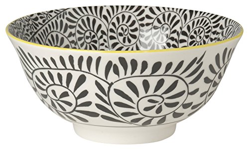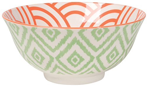 These vibrant, eye-catching bowls feature a stunning patterns and contrasting colors. Made from durable porcelain, they are as functional as they are beautiful. Each bowl features a clever pattern on the inside and outside of the bowl. A hand- painted contrasting rim color completes the look. Pair with solid dinnerware plates and glasses or more patterns for an eclectic look. Because each bowl is made of porcelain, they are microwave and dishwasher safe. Bowls measures 6.5 Inches in diameter: perfect for rice, cereal, fruit, ice cream and more. Set includes 6 matching bowls.Feature