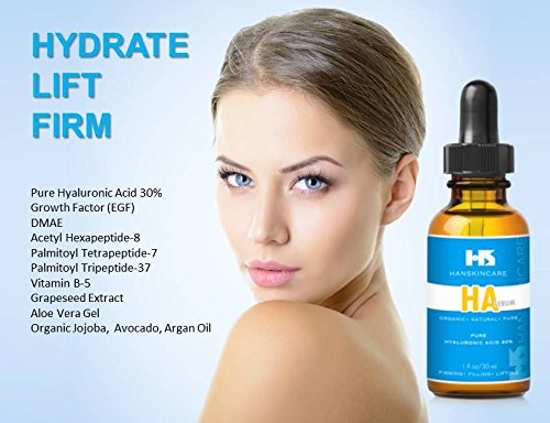 -. Binding : Misc. -. Brand : HanSkincare -. Feature : Pure Hyaluronic Acid 30%: HA provides deep hydration to the skin. This formula is proven to be highly effective by estheticians and dermatologists. / NO PARABEN, NO ALCOHOL, NO SULFATE. Safe for your skin / CLINICAL STRENGTH 30% HA serum + Organic Jojoba, Avocado, Argan Oil. Firming, Filling, Lifting, Hydrating. / MADE IN THE USA: FDA registered pharmaceutical facility / EGF, DMAE, Vitamin B5, Myristoyl Pentapeptide-8, Myristoyl Palmitoyl Tripeptide-28, Acetyle Hexapeptide-8 provides intensive rejuvenating treatment with instant lifting and firming effect. -. ProductGroup : Beauty -. ProductTypeName : BEAUTY -. Title : HanSkincare - Pure Hyaluronic Acid 30% Serum, EGF, DMAE, Palmitoyl Peptide, Organic Jojoba Oil, Organic Avocado Oil, Organic Argan Oil, Firming, Filling, Lifting, Made in USA