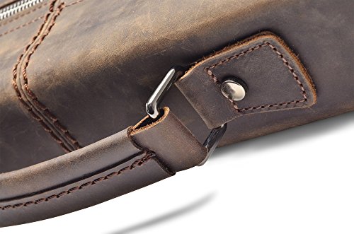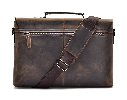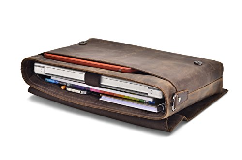 -. Feature : Genuine cow leather treated with Crazy-Horse technique / Solid chrome hardware - Durable fabric lining / Adjustable, padded and detachable leather shoulder strap / Electronic compartment for iPad or up to 13" laptop / 1 Zipper pocket in the back, 1 external pockets for easy access, 1 laptop sleeve, 2 Inside pockets, 2 pen holder, and a zipper pocket