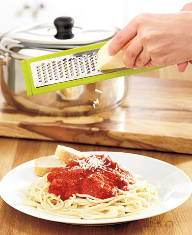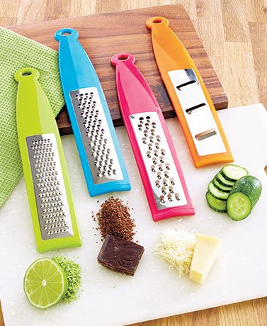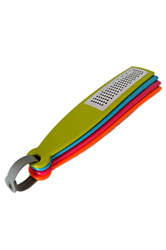 Product Description Gourmet Set 4 Handheld Graters; Multi-Color Plastic Construction with Stainless Steel Graters; 4 Grating Options; 4 Graters in One Ring; 12"L x 2 1/4"W 0