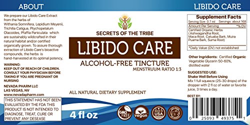 Libido Care Alcohol FREE Liquid Extract, Organic (Ashwagandha Root, Maca Root, Catuaba Bark, Muira Puama Bark, Suma Root) (4 FL OZ)
