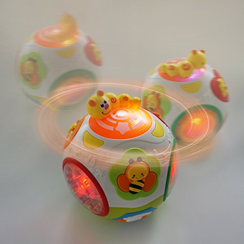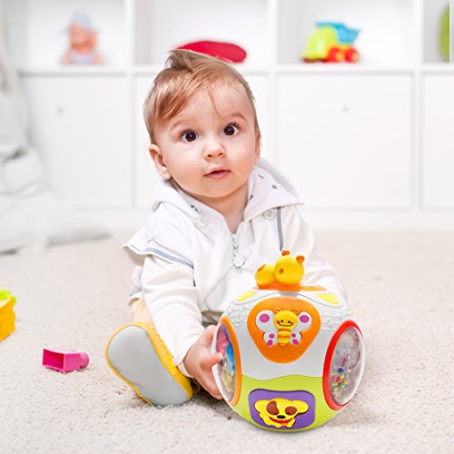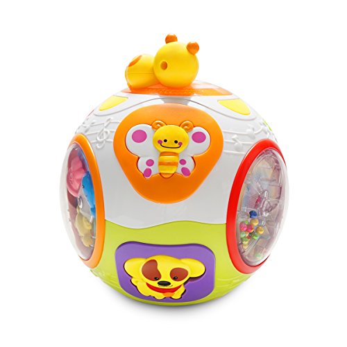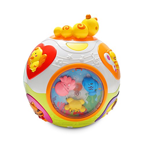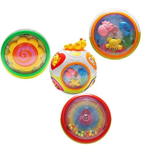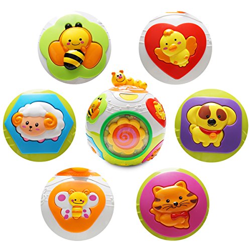 -. Feature : With rotating caterpillar, mysterious undersea world, rotary rainbow, colorful sliding beads, vivid animals with music and sound effects, this happy learning ball with lights and music will keep your baby entertained / Happy play ball will rotate by itself 360 degrees with the motor, when the ball is static, it will guide baby with "Press it" ,"Touch it" , "Move it" and other voice prompts to attract the baby's attention, it will play animal music, voice or sound effects when press any button / Press the 6 animal buttons with different color, shape, animal music, voice and sound effects to help stimulate the baby's cognitive development and hone fine motor skills / Interactive ball wiggles and wobbles on its own, it encourages your little to creep, walk and run, which helps stimulate the baby's movement development. / Toy ball with lights, music and sounds to help baby crawl and learn, requires 3pcs 1.5V AA batteries(not included), for baby 6 months and more.