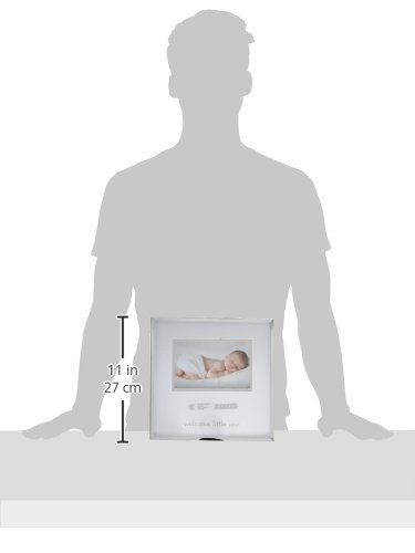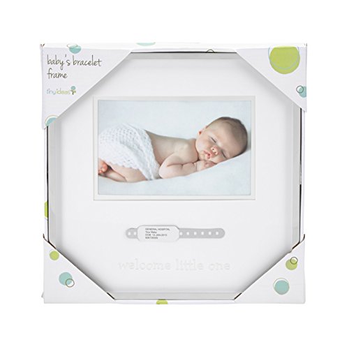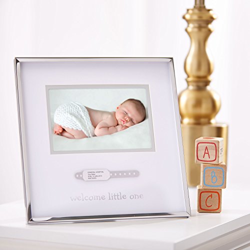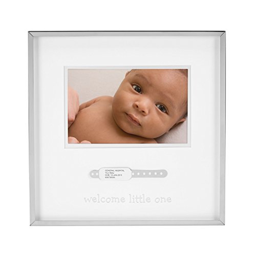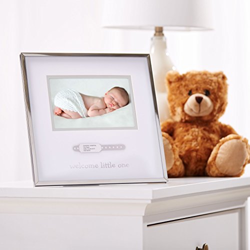 Tiny Ideas Baby's Hospital Bracelet Keepsake Frame includes one silvertone keepsake frame with sawtooth wall hanger and easel backing
