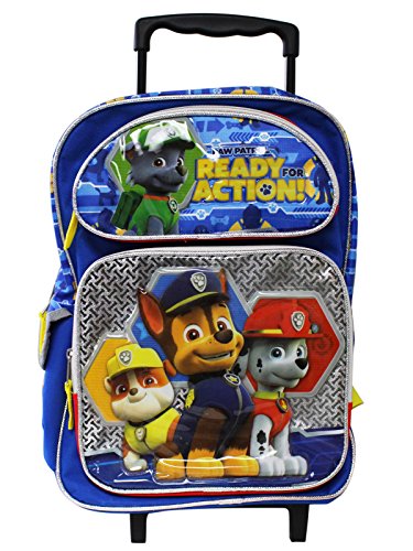 -. Brand : Nick Jr. -. ClothingSize : Full -. Color : multicolored -. Department : boys -. EAN : 0843340121703 -. Feature : Paw Patrol rolling backpack / Features a velcro close side pouch along with a mesh side pouch / Great for back to school / Contains three compartments in descending order of size / Measures 16in (40.5cm) tall, 12in (30.5cm) wide, and 5in (12.5cm) deep -. Label : Ruz -. Manufacturer : Ruz -. Model : 5599545 -. MPN : 121703 -. NumberOfItems : 1 -. PackageQuantity : 1 -. PartNumber : 121703 -. ProductGroup : Apparel -. ProductTypeName : APPAREL -. Publisher : Ruz -. Size : Full -. Studio : Ruz -. Title : Paw Patrol Ready For Action Full Size Kids Rolling Backpack (16in) -. UPC : 843340121703