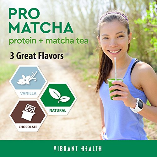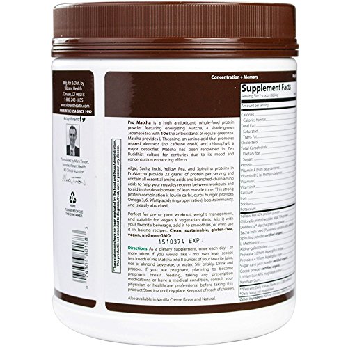 Pro Matcha is a whole food protein supplement featuring Matcha, a green tea which provides relaxed alertness as well as a strong antioxidant profile. Pro Matcha is detoxifying, energizing, curbs hunger cravings, and can be used a pre or post workout protein shake. Vegan, gluten free, non-GMO, and sustainable. Available in chocolate, vanilla, or natural. Matcha--Pro Matcha contains the world's finest and most renowned DoMatcha brand matcha tea. The whole tea leaf is consumed providing an arsenal of nutrients, vitamins, minerals, antioxidants, and amino acids - making it one of the healthiest beverages on Earth. Matcha is unique in that it provides L-Theanine, an amino acid that promotes a relaxed yet productive alertness and mood enhancement. L-Theanine works synergistically with the caffeine in Matcha to provide clarity and concentration without the jitters. Matcha provides sustained energy for up to 4 hours without the crash you may feel with coffee. It also has 6 times more amino acids than common black and green teas and is loaded with chlorophyll, a major detoxifier. Protein--Algal, Sacha Inchi, Yellow Pea, and Spirulina provide 21 grams of protein. This strong protein combination curbs hunger, provides Omega 3,6,9 fatty acids (in proper ratios), detoxifies, is low in carbs, boosts immunity, and is easily absorbed. Pro Matcha protein contains all essential amino acids and branched-chain amino acids (BCAAs). Amino acids, the building blocks of proteins, have various functions related to energy production. There are 9 essential (must get from our diets) amino acids and 12 non-essential (produced by the body) amino acids. BCAAs have been used to prevent fatigue, improve concentration, and to avoid or lessen sore muscles after exercise. BCAAs are believed to decrease serotonin levels, thus cancelling out the fatigue from exercise and enhancing exercise performance. BCAAs have also been shown to help with muscle synthesis and prevent muscle loss.Feature