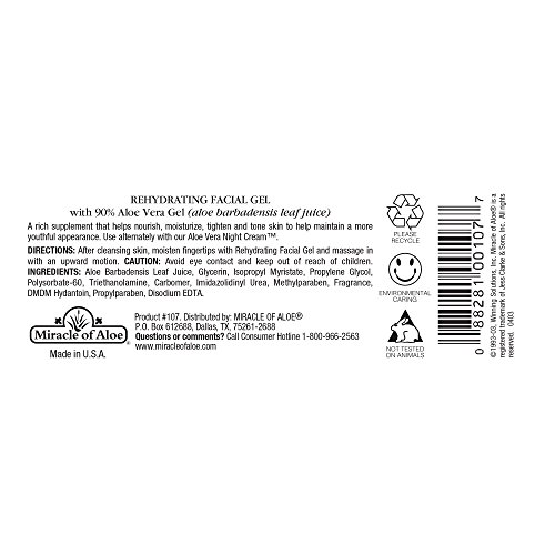 -. Binding : Misc. -. Brand : Miracle of Aloe -. EAN : 0890827318507 -. Feature : 90% pure UltraAloe® gel by volume / Aloe vera gel - nature's most potent natural moisturizer / Penetrates deep to the base of skin to nourish and restore vital moisture / Super moisturizing gel made from organically grown aloe vera leaves / Tones, tightens and moisturizes skin -. IsAdultProduct : 0 -. Label : Chom -. Manufacturer : Chom -. PackageQuantity : 1 -. ProductGroup : Beauty -. ProductTypeName : BEAUTY -. Publisher : Chom -. Studio : Chom -. Title : Rehydrating Facial Gel 1 oz - with 90% Pure Rejuvenating UltraAloe - Mother Nature’s Pure Aloe Vera Gel Moisturize And Refresh Skin. Recapture Your Youth, with Younger Looking Skin! -. UPC : 885403662303