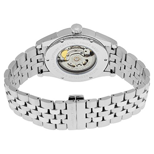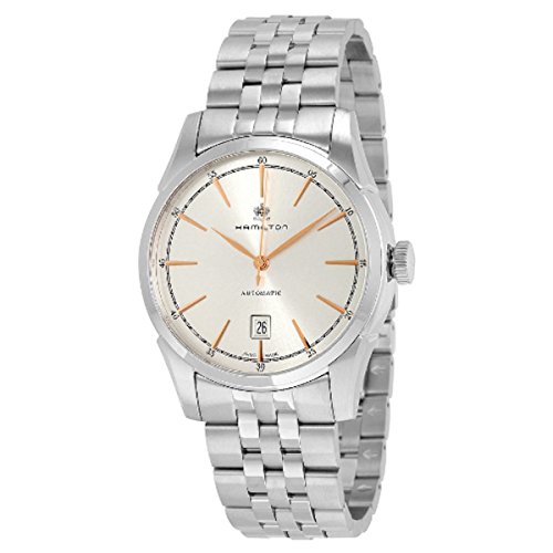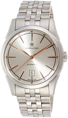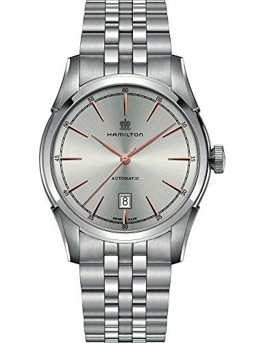 Studio : Hamilton Publisher : Hamilton Binding : Watch Product Description Stainless steel case with a stainless steel bracelet. Fixed stainless steel bezel. Silver dial with rose gold-tone hands and index hour markers. Minute markers around the outer rim. Dial Type: Analog. Date display at the 6 o'clock position. Automatic movement with an 80 hour power reserve. Scratch resistant sapphire crystal. Pull / push crown. Skeleton case back. Case diameter: 42 mm. Case thickness: 11 mm. Round case shape. Band width: 22 mm. Deployment with push button release clasp. Water resistant at 50 meters / 165 feet. Functions: date, hour, minute, second. Luxury watch style. Watch label: Swiss Made. Hamilton Spirit Of Liberty Silver Dial Stainless Steel Mens Watch H42415051. 0