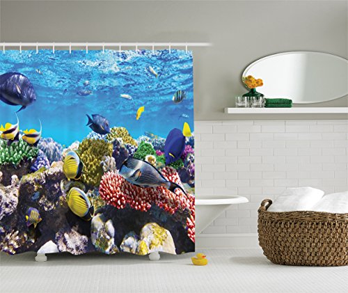 Ambesonne Ocean Decor Collection, Tropical and Exotic Coral Reefs Fish School Natural Life in a Shallow Underwater Wild Marine Seascape Pattern, Polyester Fabric Bathroom Shower Curtain, Paprika Green