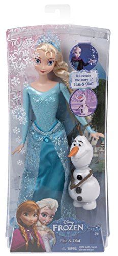 The Disney film Frozen introduces a cast of characters who tell a story of epic adventure and nonstop magic! In the movie, Elsa uses her magical powers to create things out of ice and snow, including the adorable Olaf the snowman! This exciting 2-pack features Elsa and Olaf together so that fans can re-live all the exciting moments. Elsa looks radiant and wintry pretty dressed in her iconic snowflake gown with ethereal sleeves and glittery snowflakes-she even wears her crown! This loveable pair is ready for their next adventure. Includes 1 Elsa doll and 1 Olaf figure. Dolls cannot stand alone.Feature