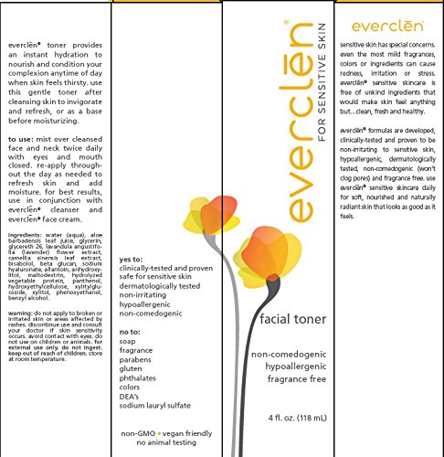 ReleaseDate : 2017-04-26 Studio : NBTY.inc - US Nutritioninc. (HPC) Publisher : NBTY.inc - US Nutritioninc. (HPC) Binding : Health and Beauty Product Description Sensitive skin has special concerns. Even the most mild fragrances, colors or ingredients can cause redness, irritation or stress. evercl?n formulas are developed, clinically-tested and proven to be safe for sensitive skin, hypoallergenic, dermatologically-tested, non-comedogenic (won't clog pores) and fragrance free. evercl?n toner provides instant hydration to nourish and condition your complexion any time of day when skin feels thirsty. Use this gentle toner after cleansing skin to invigorate and refresh, or as a base before moisturizing, for a healthy radiance that is naturally yours. 0