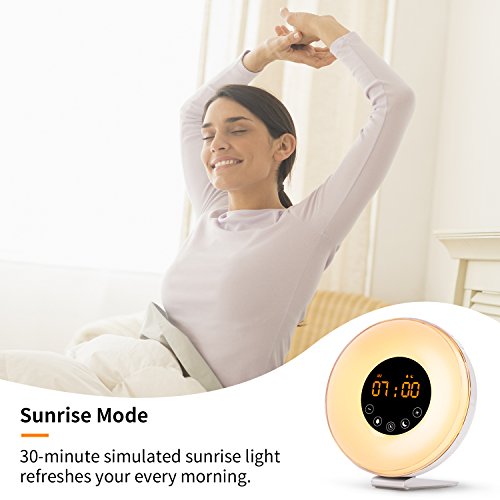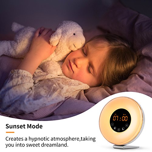 The warm light will be on 30 minutes prior to your wake-up alarm time and Its gradual sunrise eases you awake, gently and naturally. And Sunset function will guide you to natural, restful sleep.