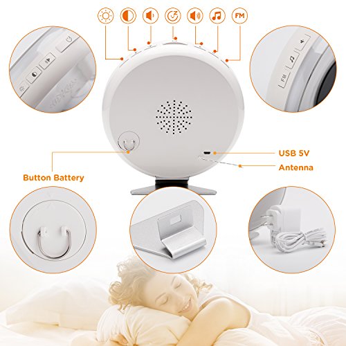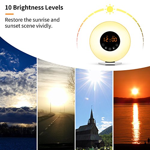 ☀【GENTAL SUNRISE】Wake up light have 10 levels brightness up to 102.34 Lumens.It starts shining 30 mins before your set time which gently brings you out of deep sleep to wide awake from dark yellow to shiny white.