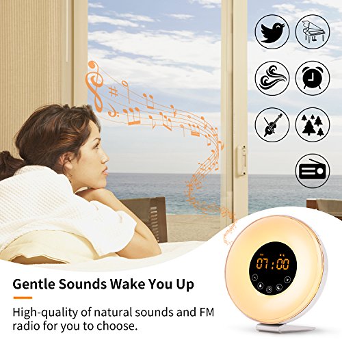 ☀【6 NATURE SOUNDS AND MULTI-COLOR】If you miss the birds singing in mountain you can set it as alarm clock.Fiery Youth wake up light have 6 sounds and FM radio (could search up to15 channels) meet up all your expectations; 7 fixable colors allow you express mood through lights.