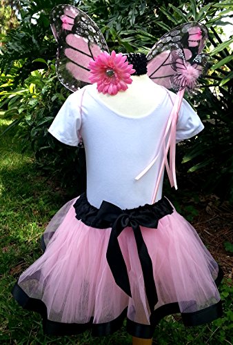 -. Feature : Soft tutu trimmed in satin with a satin bow / Wings have a sturdy frame and measure 15"x13" with soft elastic straps / Crochet headband with pink flower / Wand measures 15" long with a matching butterfly and ribbons