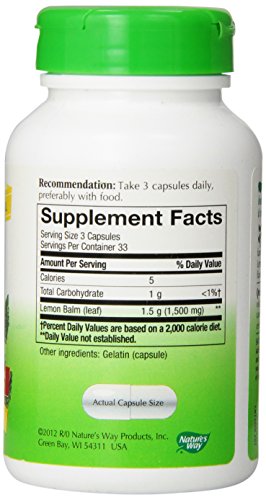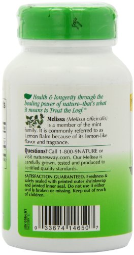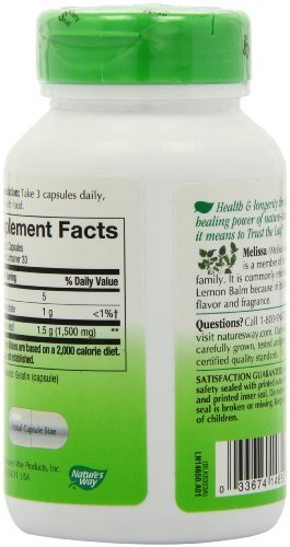 -. Binding : Health and Beauty -. Brand : Nature's Way -. Label : NATURE'S WAY -. Manufacturer : NATURE'S WAY -. PackageQuantity : 1 -. ProductGroup : Health and Beauty -. ProductTypeName : HEALTH_PERSONAL_CARE -. Publisher : NATURE'S WAY -. Studio : NATURE'S WAY -. Title : Melissa (Lemon Balm)