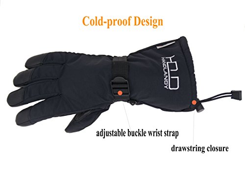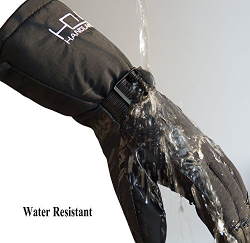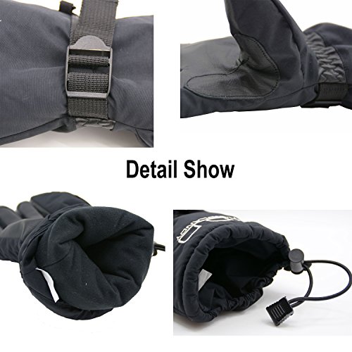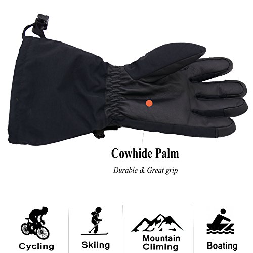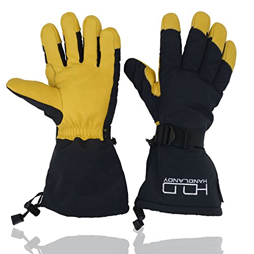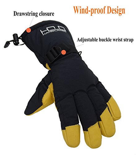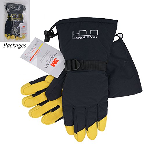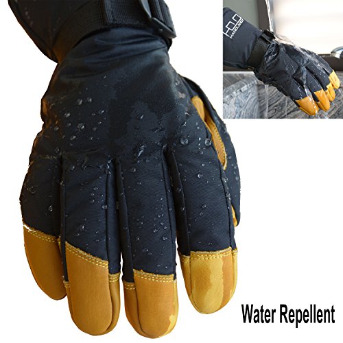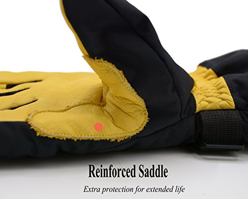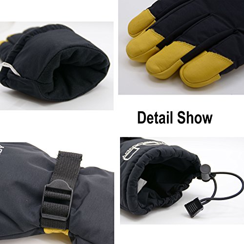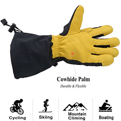 This thermal ski gloves are featured for keeping super hands warm, even when the temperature drops between -20°F and 0°F. The insulation is consisted of 100 gram 3M thinsulate and 350 gram high density warm cottons. Quick adjustable cuff strap and drawstring bottom keep the gloves tight, the drawstring on the end is flexible to adjust to hold your coat sleeve. These winter thermal gloves are made from carefully-selected A grade cowhide that is soft, durable, and provides perfect protection for your hands when you are exercising, caring for pets, doing housework, or gardening. With waterproof layer back on the inside keeps your hands dry in snow or light rain, ideal winter thermal gloves for morning bike commuting and shoveling snow. Please note that the fabric of shell is waterproof, but it is not suitable for dipping gloves into water for a long time because the seams of the fingers is not waterproof. Perfect Fit for Men, Women Teens - The flexible fabric makes these gloves a perfect fit for men and women from teens through adults, it's a nice Christmas gift for all. Specifications: Palm: Cowhide Back: Polyester Liner: Thinsulate, cotton Gender: men women teens unisex Size: Medium/ Large/ XL(Extra Large) M: 4.25"X 12.75" L: 4.5"X 13" XL: 4.75"X 13.25" Color: Yellow Black Type: Winter Thermal Ski Gloves Due to manual measurement, it's allows 1-3(cm) discrepancy Please note that the back of shell is waterproof, but it is not suitable for dipping gloves into water for a long time because the seams and cowhide palm is not waterproof.