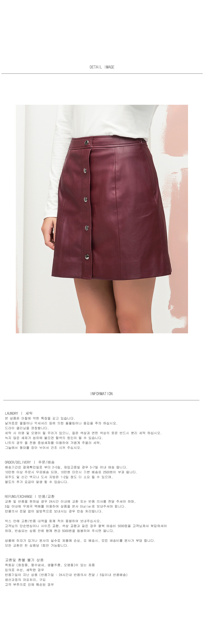 리얼 레더보다 더 가죽같은 부드러운 PU 재질의 페이크 레더로 제작된 미니 스커트 입니다. 앞부분의 스냅 디테일이 특징이며, 앉거나 움직일때 벌어져서 치마 속이 보이지 않게 앞 스냅 부분은 열리지 않는 페이크 플라켓 (FAKE PLACKET) 형식으로 되어 있습니다. 하이 웨이스트 (HIGH-WAISTED) 허리라인과 적당한 A-LINE 실루엣이 다리를 더 길고 가늘게 해보이는 효과를 줍니다.