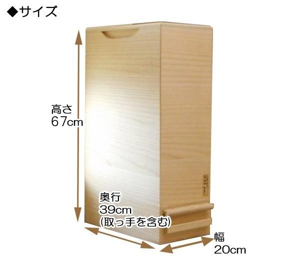 シンプルなデザインで、どんなキッチンにもなじむ桐製の米びつです。通気性が良いので、お米をおいしいまま保存できます。 製造国:日本 素材・材質:桐(北米産) 商品サイズ:約(横幅)20×奥行39×高さ67cm 重量:5kg 仕様:容量:約20kg※20kgより少し多く入ります。 付属品:紙ヤスリ ※サプライヤー直送品 ご注文後3~4営業日後の出荷となります【商品名】総桐一合計量米びつ20kgサイズ