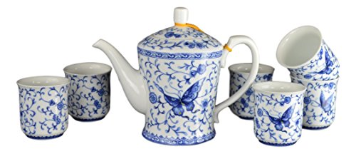 -. Title : 7 Pcs Premium Ivy Butterfly Blue and White Tea Set Fine Tall Tea Pot Tea Cups Traditional
