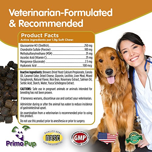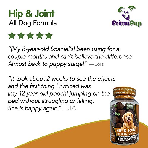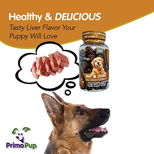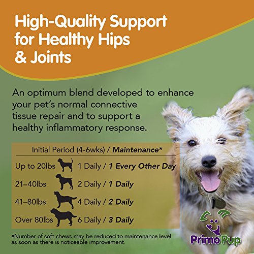 -. Binding : Misc. -. Brand : P.R.Imo Pup -. EAN : 0683203927444 -. Feature : SUPPORT FOR HIP & JOINTS: Enhances connective tissue repair to support healthy inflammatory response / YOUR DOG DESERVES IT: Helps provide a lubricating cushion between joints to enhance comfort / VETERINARIAN FORMULATED & RECOMMENDED: Healthy & delicious liver flavor your dog will love! / MADE IN USA: P.R.Imo Pup® products use high quality ingredients, are grain free & are NASC Certified / CUSTOMERS SAY: Easier for my dog to get up, and she's bouncing like a puppy again! She loves them! -. Label : P.R.Imo Pup -. Manufacturer : P.R.Imo Pup -. MPN : 107 -. PackageQuantity : 1 -. PartNumber : 107 -. ProductGroup : Pet Products -. ProductTypeName : PET_SUPPLIES -. Publisher : P.R.Imo Pup -. Studio : P.R.Imo Pup -. Title : P.R.Imo Pup® Hip & Joint Supplement | Enhances Joint Health for Dogs | Supports Cartilage & Connective Tissue | Contains Glucosamine, Chondroitin & MSM | Veterinarian Developed | 60 Soft Chews -. UPC : 683203927444