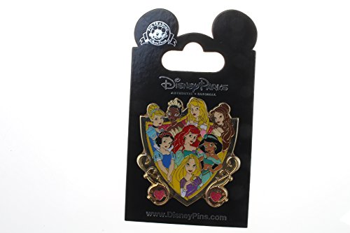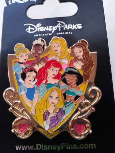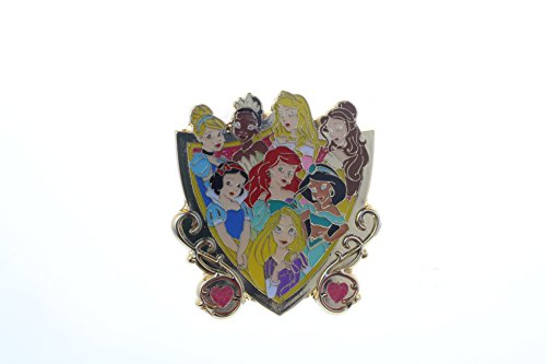 This Storybook Princess pin features 8 Princesses - Cinderella, Tiana (Princess and the Frog), Aurora (Sleeping Beauty), Belle (Beauty and the Beast), Snow White (Snow White and the Seven Dwarfs), Ariel (The Little Mermaid), Jasmine (Aladdin) & Rapunzel (Tangled). They are shown in a shield/crest shaped pin which has two pink hearts on the side.Feature