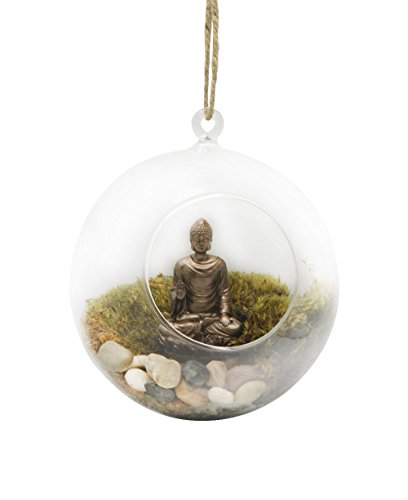 -. Feature : Hanging globe terrarium with moss plant / Comes with pebbles and Buddha statue / Dome is 6 inches wide and 7 inches tall