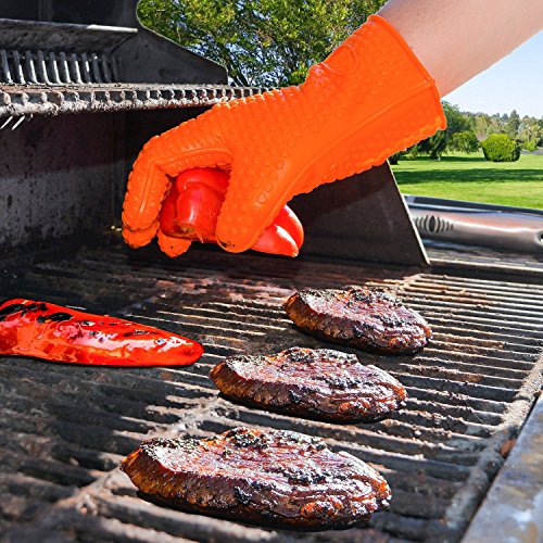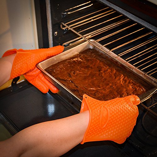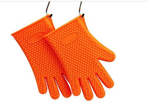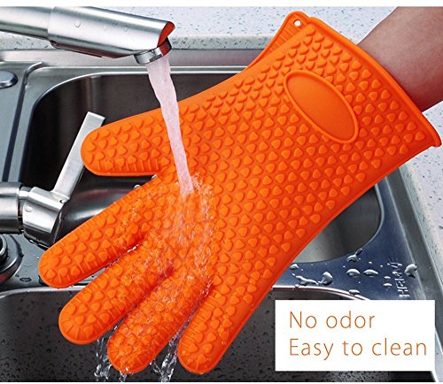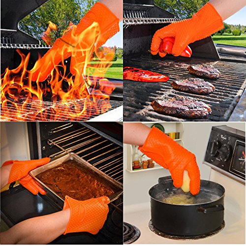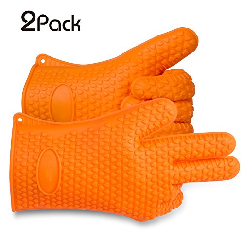 - TOP QUALITY: This great pair of gloves is made of heat resistant silicone for temperatures up to 425 Degrees Fahrenheit. As the silicone used is 100% pure, FDA approved and food-safe, feel free to touch your food directly with them; the quality of the material is undoubted! They also are 100% waterproof to keep your hands safe.