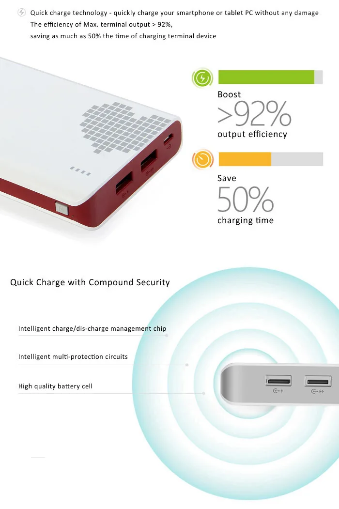 The quick self-charging IC solution prodvides 88% of the charging efficiency at 2.1A for quick charging.A mobile power device can be fully charged in the half-saved time.