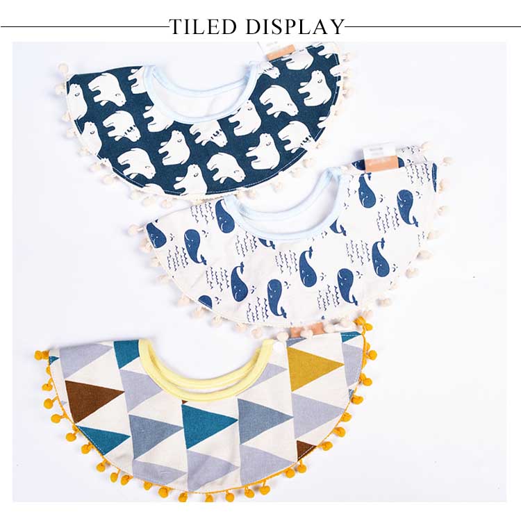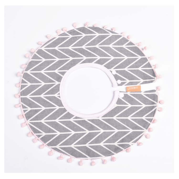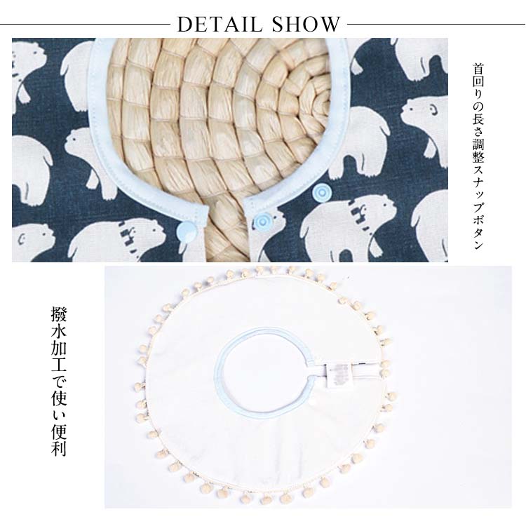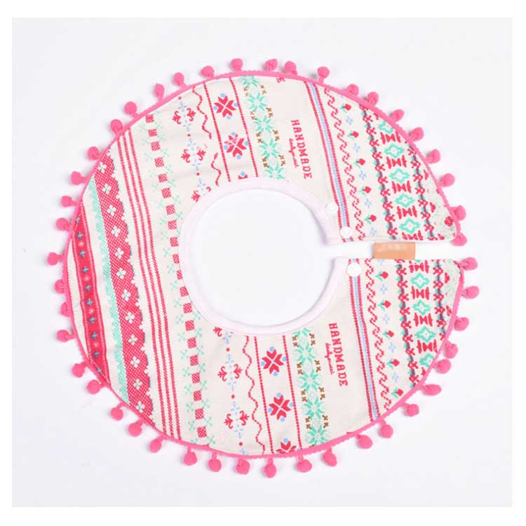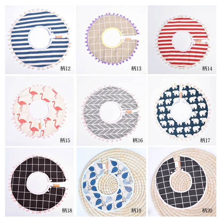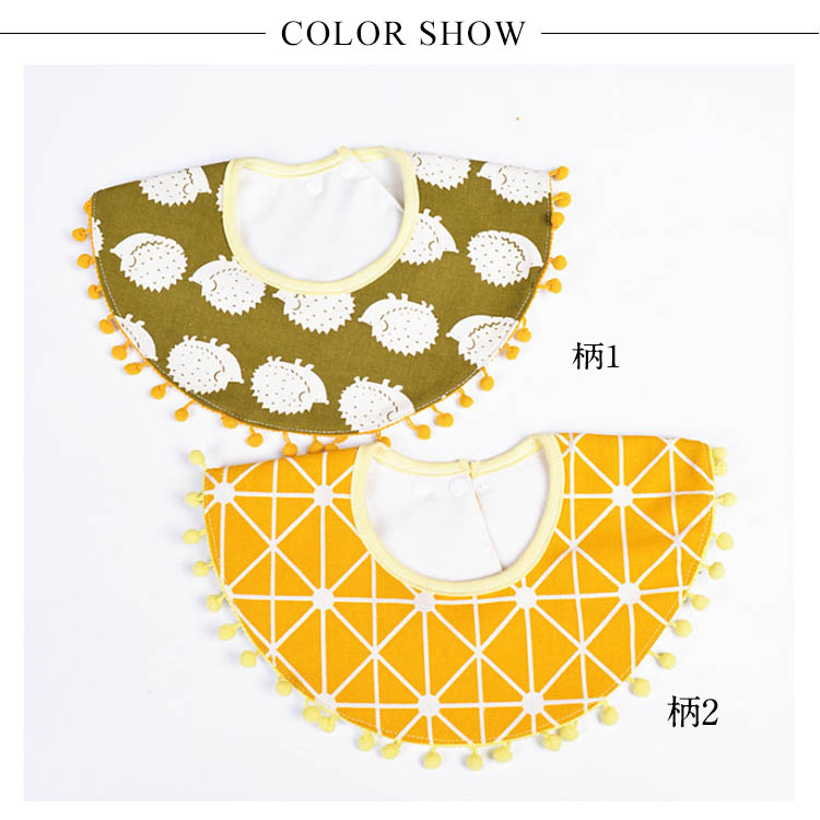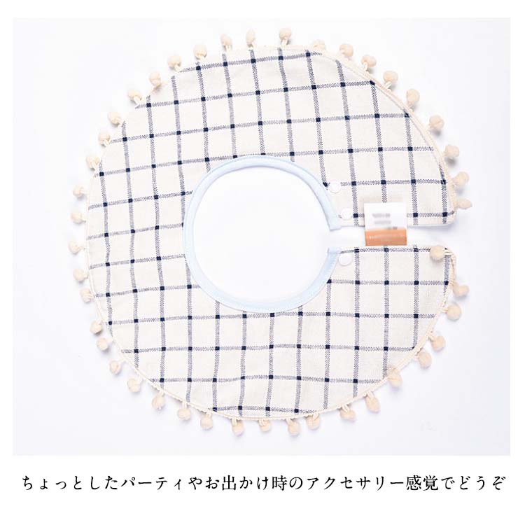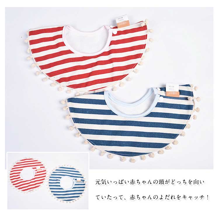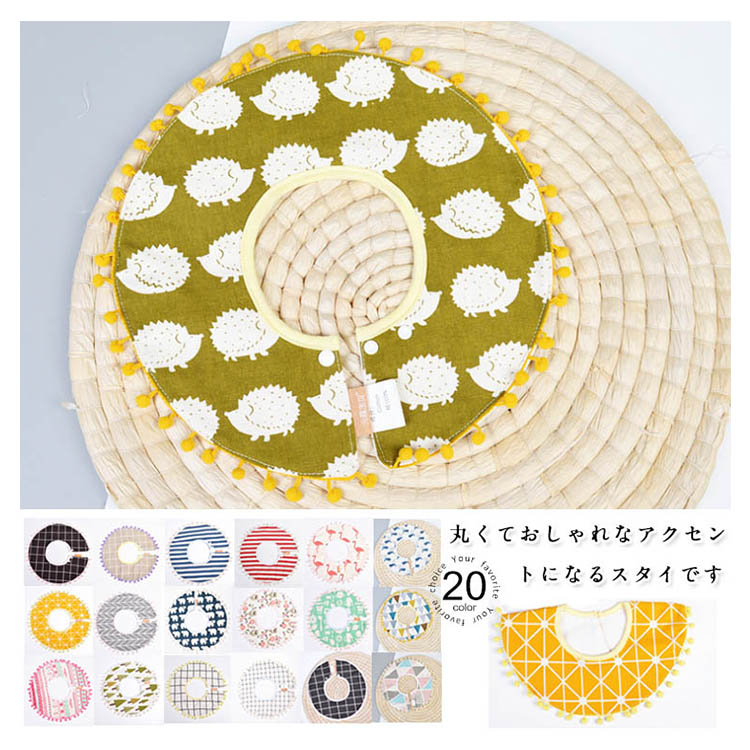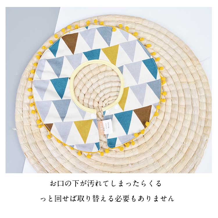 | 丸くておしゃれなアクセントになるスタイです。元気いっぱい赤ちゃんの頭がどっちを向いていたって、赤ちゃんのよだれをキャッチ!お口の下が汚れてしまったらくるっと回せば取り替える必要もありません。ちょっとしたパーティやお出かけ時のアクセサリー感覚でどうぞ。 | |