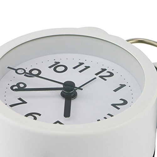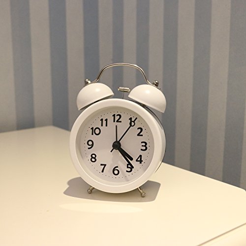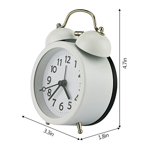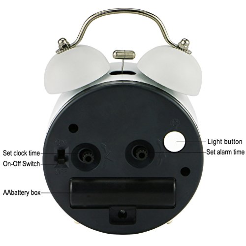 * Super Loud alarm clock, double bell retro design,bring you to your childhood or school days,wake you up even you are a heavy sleeper * Smooth Sweeping Quartz, ensure a quiet life envioment when it work,will not disturb or distract you * No snooze function, so you would not sleep a little longer then late for school,work or date,switch the alarm button to "OFF" to stop the bell ring * Large arabic numbers, good-looking and easy to read,good for all ages, even for person with poor eyesight * Backlight feature, the light for seeing the time at night is easy to operate when half asleep,just press the buttons * Classic white color, functional and decorative clock to your home and desk, a perfect gift for children,family or friends * Easy to set the time/alarm clock, pls turn the adjuster in anti-clockwise direction as the indication shows * with Stainless steel top handle,convenient to carry it to travel or hang on the wall * Suitable clock legs length,will not fall down easily