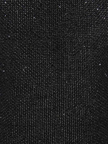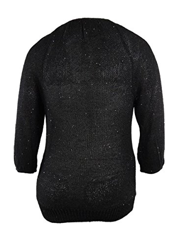 Sweater features no lining, split V-neck with gold detailing, sheer sequined knit fabric, 3/4 sleeves, and pullover style.