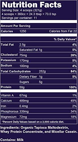MAXIMUM NUTRITION: 50g of Protein, 252g of Carbs, 1,250 Calories, 11.5g of BCAAs (branched-chain amino acids) per serving and only 5g sugar.
