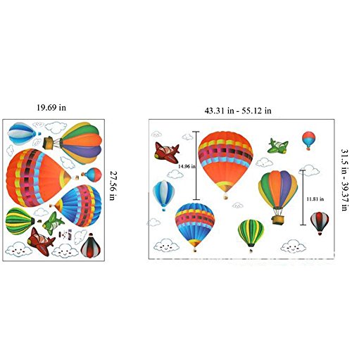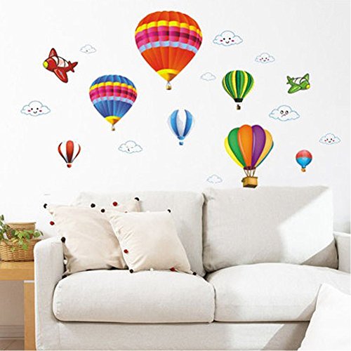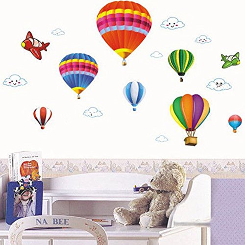 Cute 3D Vinyl Hot Air Balloon Wall Stickers AirPlane Smiley Face Puffy Clouds Stickers Decor Girls Boys Children and Kids Living Room Bedroom Bathroom