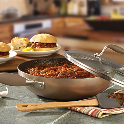 Ideal for poaching chicken in a flavorful broth, simmering a beef chili or even poaching eggs for a special brunch spread, a chef pan can make a variety of recipes easy to tackle. This chef pan features a convenient helper handle, which will make moving the pan around the kitchen and even taking it in and out of the oven worry-free. This metal utensil-safe Anolon® Advanced Bronze 12-inch chef pan features a revolutionary ergonomic Anolon SureGrip® handle, a combination of durable stainless steel and silicone rubber, along with a convenient helper handle of the same materials. The handles not only provide a confident and soft grip, but they are also oven safe to 400°F. The pan’s heavy gauge, hard-anodized construction ensures efficient, even heat distribution for exceptional gourmet cooking performance. DuPont’s rugged Autograph® 2 nonstick surface inside and out is ideal for both healthy cooking and easy cleanup. Restaurant tested by professional chefs, Autograph® 2 delivers superior durability that stands up to the rigors of a professional kitchen. The glass lid is also an ideal addition, allowing cooks to monitor food without losing heat or moisture. Anolon® Advanced Bronze cookware offers a sophisticated professional look that will complement every kitchen.Feature