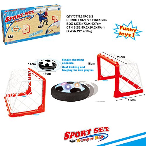 Studio : Sacow Publisher : Sacow Product Description LED Air Power Training Ball Soccer Football Goal Set Hover Ball With 2 Gates Descriptions: Set Pack Non-Toxic Plastic. ENDLESS FUN -- With 2 Portable goals(23*16*16cm).It's like building a soccer field at home. More interesting than Single Soccer Toy. Your kids can play it like a real soccer activities with his/her friends.Intended for ages up 3 years. DURABLE LED HOVER SOCCER -- You can kick it like a real soccer ball, not just a toy!You can turn any floor into an air hockey/soccer surface, perfectly at home on wood, linoleum, polished concrete, and even low-pile carpet. It also has colored light on ball surface with button, making your night game wonderful. Must be powered by 4 "AA" batteries (NOT INCLUDED). GLIDE FUNCTION WITH MODEST SIZE -- With the modest size , neither too big nor too little. More suitable for multiplayer game. Play by yourself or grab a friend or two! The Air Power Soccer Disk will provide hours of dynamic high-tech soccer action. The best choice for kids Birthday gift or Christmas gift. SAFE TOY GAME -- 100% brand new and high quality combine disc and hovercrafts. With Substantial ,non-marking foam bumper which keeps it from damaging or marking up walls and furniture. 100% SATISFACTION GUARANTEE -- Bonwayer strongly stands behind each item it designs and sells. Each product is backed with a one-year warranty and 100% Satisfaction Guarantee. Specification: Recommended Age:1 - 15 years Color: Black White Material: Non-toxic plastic Battery: 4 * AA batteries (Not included) Package: 1 Set Air soccer power soccer