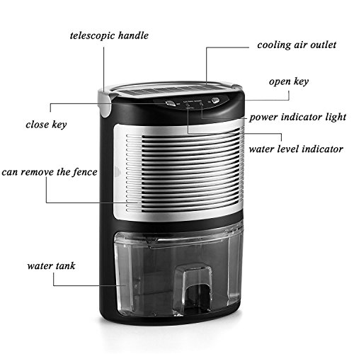 DEHUMIDIFICATION CAPACITY: Modern design compact portable dehumidifier with 600ml-800ml /day, extraction rate at 85% RH. 30℃. And Low energy consumption that use up only 60W. Application area is about 2200 Cubic Feet which with 1000ml water tank