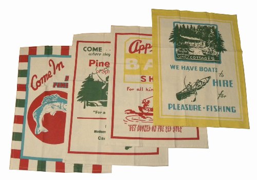 -. Feature : Set of 4 Vintage Style Fishing Towels / 100% cotton / Bait and Tackle Theme / Vintage Fishing Ads