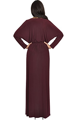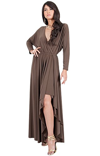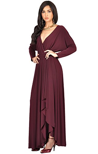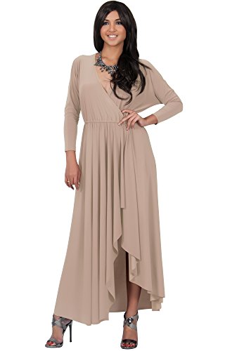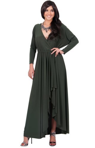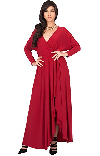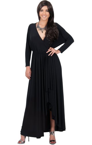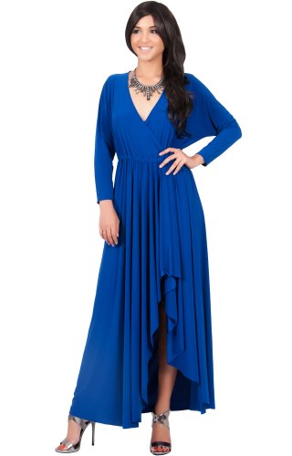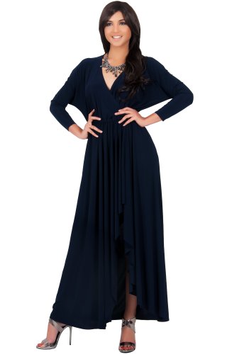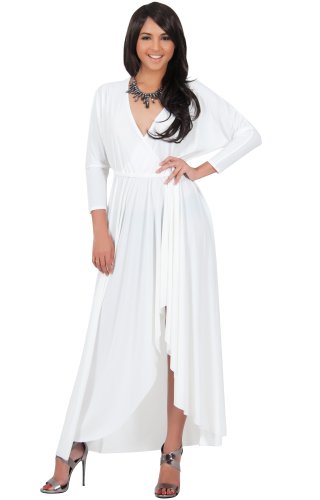 These stunning maxi dresses with sleeves from Koh Koh features a wrap style bodice with a beautiful asymmetric skirt that leads to a cascading draped split & an elastic empire waist that insures a perfect fit every time. This is the perfect maxi dress for every occasion, simply stunning and versatile but well suited as a cocktail maxi dress or evening maxi dress during the cooler months. Many customers have worn it for winter weddings, it makes a wonderful mother of the bride dress or mother of the groom dress. The ivory or white color is the perfect understated winter wedding dress. These versatile maxi dresses are available in many sizes, it really does make a wonderful plus size maxi dress.Feature