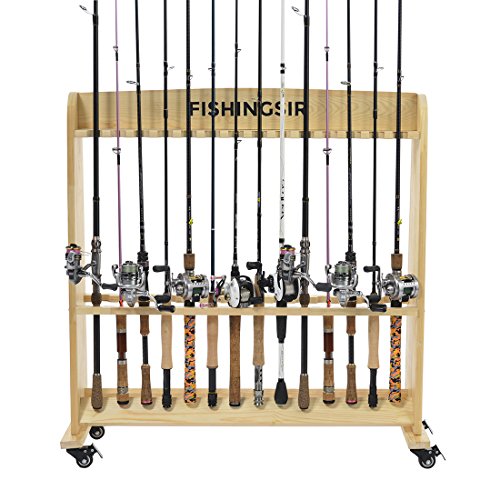 -. Title : Wooden Fishing Rod Rack with Wheels ,up to 28 Pole and Reel Holder Stand Portable Vertical Large Rolling Rod Cart Storage-Anti Cut Gloves as FRR GIFT