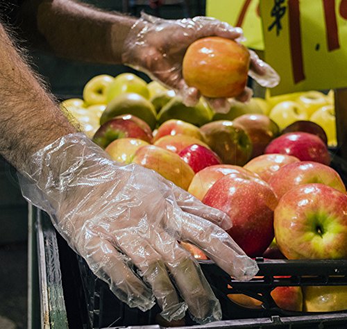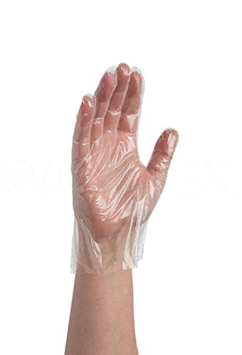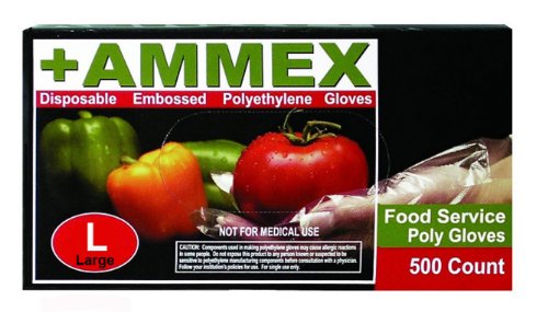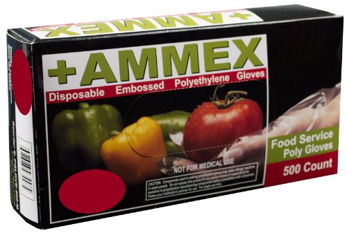 The Ammex food service polyethylene, powder-free glove is 1 mil thick and 9.5" long from the tip of the middle finger to the edge of the wrist. Polyethylene is a thin plastic resin that provides a barrier between hands and foods during food preparation, and is appropriate for single use and frequent changing. This glove complies with Food and Drug Administration (FDA) regulations for food contact (21CFR, 170?199) and is suitable for the food service industry to help prevent contamination during food preparation. The glove is embossed on the fingertips, fingers, and palm for improved grip, particularly in wet conditions. This powder-free glove leaves no residue, reducing the risk of contamination compared to a powdered glove. This ambidextrous glove is clear.