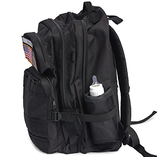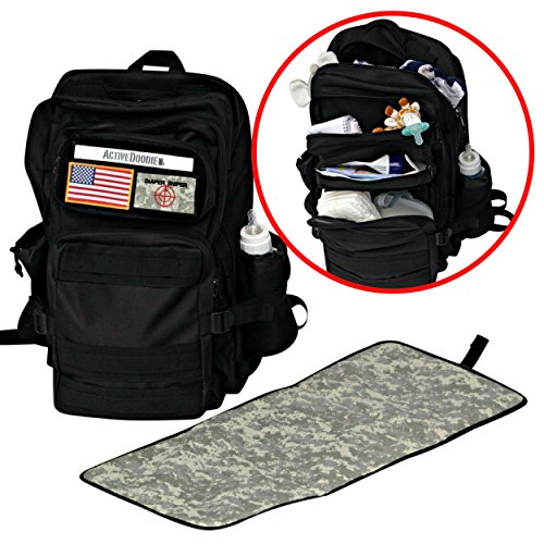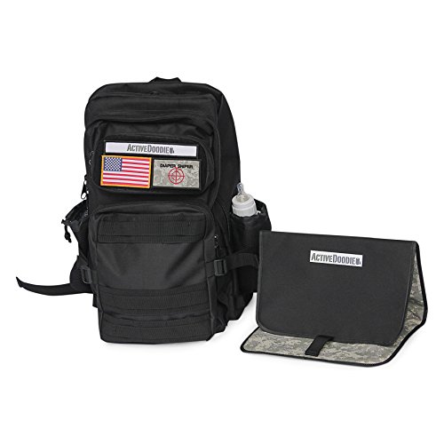 The ActiveDoodie Diaper backpack and changing pad helps you and your baby survive dad hood. This baby diaper backpack is not like other diaper backpacks. We are military inspired and built tough. This diaper backpack is built to be durable and is a the perfect hiking, travel backpack diaper bag. Fitted with two quick access bottle holders, one of them being insulated allows you to keep that bottle at the right temp. Five compartments ranging in size perfectly fit everything you need for survival while making sure you can focus on your baby safety. Do not be the mom or dad lugging an oversized purse your wife picked out, this is the perfect baby diaper backpack for women or men alike. This adult diaper backpack is comfortable to wear is a durable high quality 600 denier polyester material that can withstand the destruction that often comes with kids. This tactical backpack diaper bag comes with three velcro patches, Activedoodie, the American flag and the camo Diaper Sniper patch. Included the camouflage changing pad fits its own compartment in the main pocket on the front of the large diaper backpack. This diaper backpack will last for years and transform from a newborn diaper backpack, to baby backpack diaper bag, toddler backpack diaper bag and be around for many kids to come. Always be prepared and be a diaper sniper.Feature
