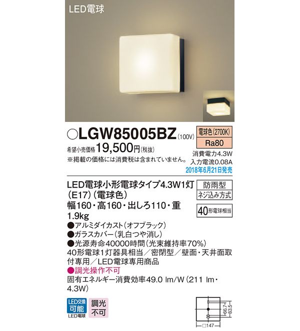●光源:LED電球小形電球タイプ4.3W1灯(E17)(電球色)、色温度:2700K、光源寿命40000時間(光束維持率70%)
