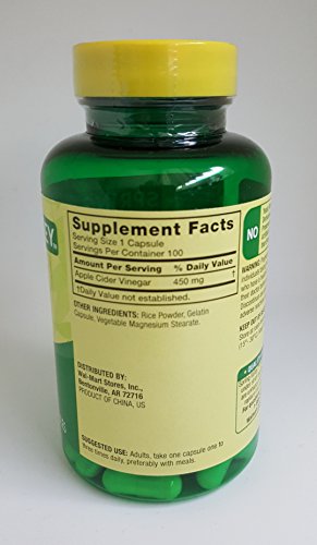 -. Binding : Health and Beauty -. Brand : Spring Valley -. EAN : 0615541156743 -. IsAdultProduct : 0 -. Label : Spring Valley -. Manufacturer : Spring Valley -. ProductGroup : Health and Beauty -. ProductTypeName : HEALTH_PERSONAL_CARE -. Publisher : Spring Valley -. Studio : Spring Valley -. Title : Spring Valley Apple Cider Vinegar 450 mg Dietary Supplement 100capsules -. UPC : 615541156743