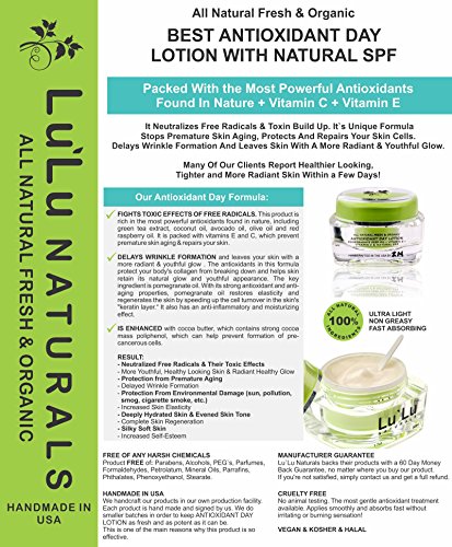 -. Binding : Misc. -. Brand : Lu'Lu Naturals -. Feature : FIGHTS TOXIC EFFECTS OF FREE RADICALS. This product is rich in the most powerful antioxidants found in nature, including green tea extract, coconut oil, avocado oil, olive oil and red raspberry oil. It is packed with vitamins E and C, which prevent premature skin aging & repairs your skin. / MANUFACTURER GUARANTEE & HANDMADE IN USA - Lu`Lu Naturals backs their products with a 60 Day Money Back Guarantee, no matter where you buy our product. If you're not satisfied, simply contact us and get a full refund. We handcraft our products in our own production facility. Each product is hand made and signed by us. We do smaller batches in order to keep our Antioxidant Day Lotion as fresh and as potent as it can be. This is one of main reasons why this product is so effective. / THIS FORMULA IS ENHANCED with cocoa butter, which contains strong cocoa mass poliphenol, which can help prevent formation of pre-cancerous cells. / DELAYS WRINKLE FORMATION and leaves your skin with a more radiant & youthful glow . The antioxidants in this formula protect your body's collagen from breaking down and helps skin retain its natural glow and youthful appearance. The key ingredient is pomegranate oil. With its strong antioxidant and anti-aging properties, pomegranate oil restores elasticity and regenerates the skin by speeding up the cell turnover in the skin's "keratin layer." It also has an anti-inflammatory and moisturizing effect. / FREE OF ANY HARSH CHEMICALS. ALL NATURAL FRESH & ORGANIC Product - FREE of: Parabens, Alcohols, PEG`s, Parfumes, Formaldehydes, Petrolatum, Mineral Oils, Parrafins, Phthalates, Phenoxyethanol, Stearate. No animal testing. The most gentle antioxidant anti-aging treatment available. Applies smoothly and absorbs fast without irritating or burning sensation! -. HazardousMaterialType : Unknown -. Label : Lu'Lu Naturals -. Manufacturer : Lu'Lu Naturals -. Model : AOD-01 -. MPN : AOD-01 -. NumberOfItems : 1 -. PackageQuantity : 1 -. PartNumber : AOD-01 -. ProductGroup : Beauty -. ProductTypeName : BEAUTY -. Publisher : Lu'Lu Naturals -. Studio : Lu'Lu Naturals -. Title : EXCELLENT All Natural & Organic Antioxidant Day Moisturizer With Natural SPF - For Visable Anti Aging Results You Were Looking For Regardless Of Your Skin Type (Dry, Normal, Oily, Combination, Sensitive)! This Anti Aging Moisturizer Neutralizes Free Radicals & Toxin Build Up. Stops Premature Skin Aging, Protects And Repairs Your Skin Cells With Most Powerful Antioxidants Found In Nature: Green Tea Extract + Pomegranate Oil + Coconut Oil + Avocado Oil + Extra Virgin Olive Oil + Red Raspberry Oil. Formula Full Packed With Vitamin E + Vitamin C. Delays Wrinkle Formation And Leaves Skin With A More Radiant & Youthful Glow. The Anti Aging Results You Were Looking For - 100% Guaranteed! Handmade in USA. Vegan, Kosher & Halal. Cruelty FREE. Ultra Light - Non Greasy - Fast Absorbing - Paraben FREE! Alcohol FREE! 1.7 Ounces