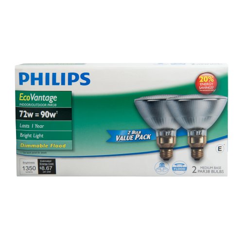 Studio : Philips Publisher : Philips Binding : Tools Home Improvement Product Description Philips EcoVantage 72-Watt PAR38 flood light light bulb two-pack is ideal for use in living rooms, bedrooms, hallways, bathrooms, dining rooms, offices, kitchens. Philips EcoVantage bulbs are a bright, energy saving alternative to standard incandescent light bulbs. It provides a bright, white wide beam of light which is ideal for general room, accenting art and architecture, as well as enhancing your outdoor landscaping. They reduce energy consumption without sacrificing the qualities of a traditional bulb and produce high quality light more efficiently. Fully dimmable, this energy saving household light bulb contains no mercury and replaces your current 90-Watt incandescent, saving you up to 28% in energy costs. Use them in your existing fixtures just as you would standard incandescent and your home will look great while you save energy. 0