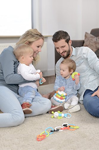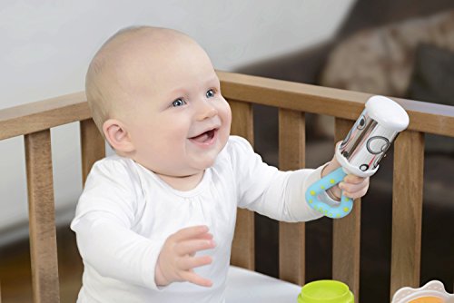 This rattle with a reflective surface has an easy grip textured handle, great for teething, and a gentle bell chime sound that will surely please a baby.