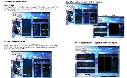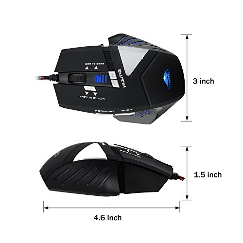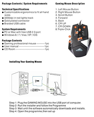 -. Feature : Ergonomically designed, long-term use without fatigue. / Gaming Performance: Adjustable 4000 DPI (800, 1600, 2400, 3200 and 4000 DPI) with 8 individual LED color indicators. AVAGO 3050 sensor, Omron micro switches, 1000 Hz polling rate, 7000 FPS. / 8 Buttons: Wheel Key, Left Button, Right Button, Page up, Page down, DPI Switcher, customize the buttons via setting the program in CD. / Cool LED lights: The gaming mouse is featured with 8 cool LED colors, 8 breathing modes, highlighting the atmosphere of the game. / Compatible system: Windows 98/ 2000/ ME/ NT/ XP/ 7/ 8/ 9/ 10 Mac OS and others.