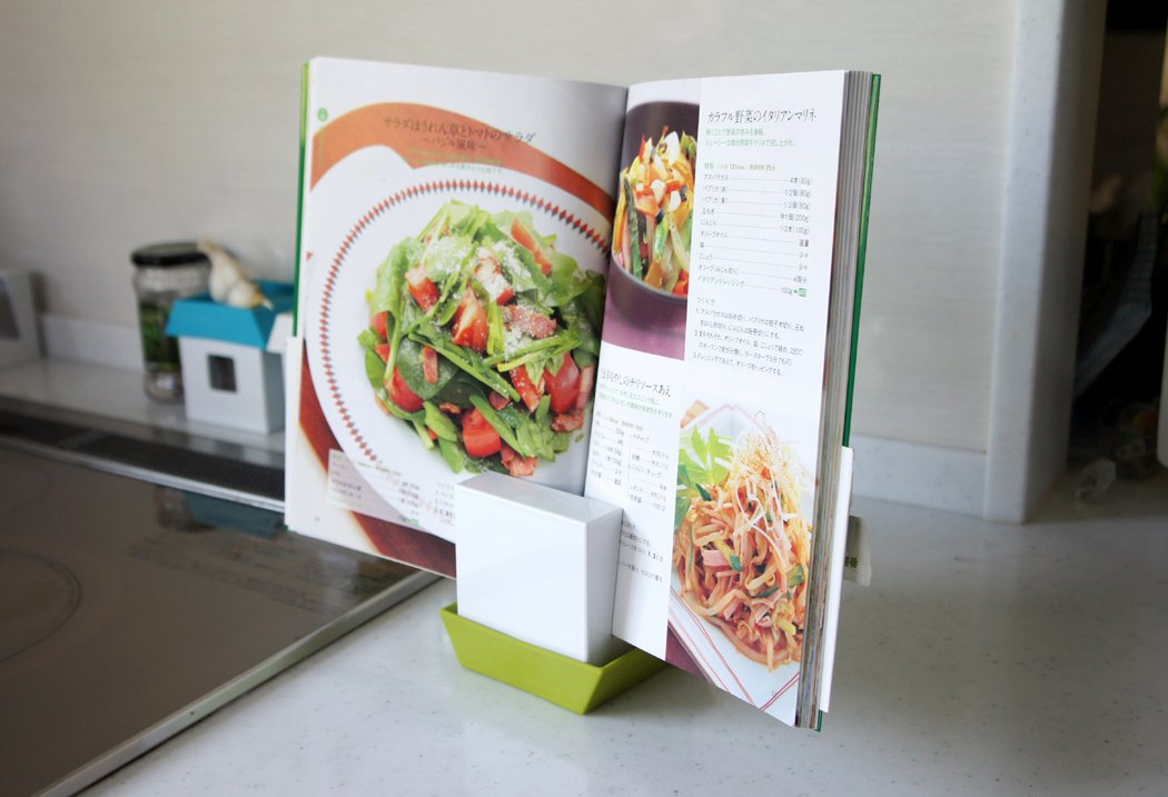 Can be used as stand for pot lid, recipe, kitchen tool
