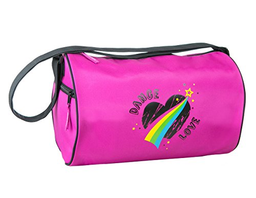 -. Brand : Horizon Dance -. Color : Pink/Multi -. Department : womens -. EAN : 0812719011761 -. Feature : A medium-sized fuchsia pink dance duffel that features a heart and rainbow design on one side. / Zipper closure. Fully lined in fuchsia pink. Adjustable shoulder strap. Color-coordinated black zippers and trim. / One zippered exterior end pocket. No interior pockets. / Medium, 14" x 9" in diameter. Material: microfiber. / Recommended for aspiring dancers young and old. -. Model : 6800 -. ProductGroup : Apparel -. ProductTypeName : LAGE -. Size : One Size -. Title : Horizon Dance 6800 Rainbow Medium Duffel Bag for Dancers -. UPC : 812719011761